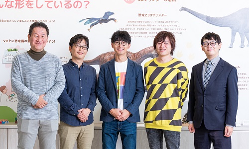 VR恐竜展システム・WebAR担当/日暮敬行(写真左から4人目)、宮原豪希(写真:一番右)