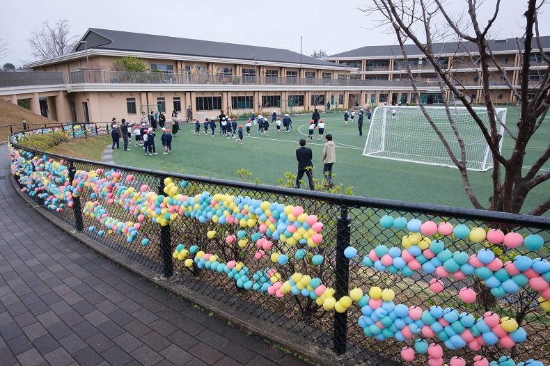2024年2月に近畿大学附属小学校・幼稚園で実施したワークショップは、これまでの成果を検証するイベントの一つでした。校内・園内の金網をキャンバスに見立て、子どもたちに絵や文字、カラーボールで思い思いに飾ってもらうというもので、みなさん嬉々として取り組んでくれました。学校は社会の一つの縮図ですから、実際の街づくりに役立てるという意味で大きな手応えが得られました。