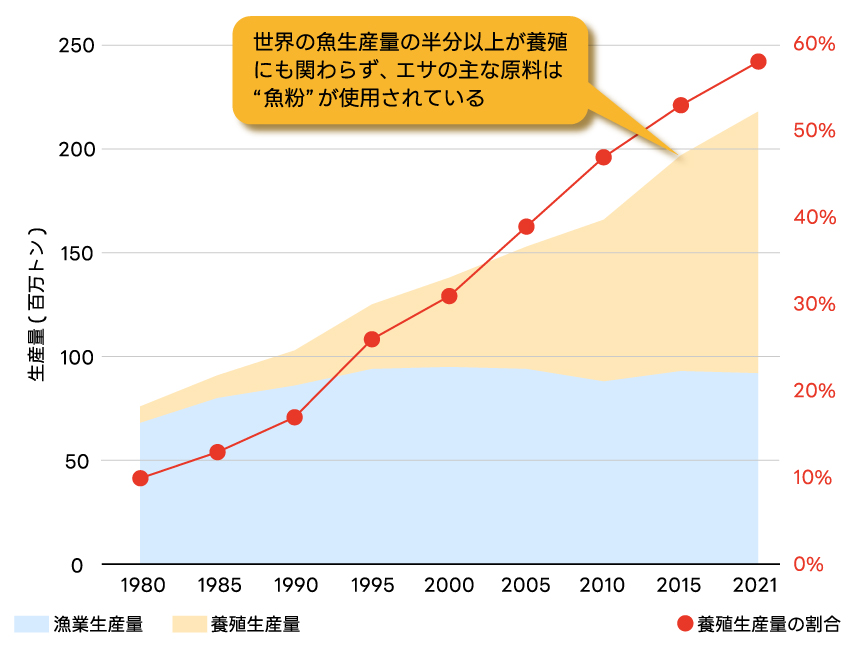 日本の水産養殖業が抱える大きな問題の一つが、エサです。タイやブリなどの海産魚を養殖する際、エサは主に魚紛が使われているのですが、実は生産される魚よりも多くの天然魚を使っているのです。これでは持続可能とは言えません。