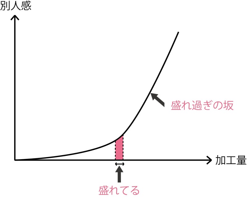 久保:そういう意味では、プリントシールも実はそうなのです。「盛りたいけど、盛り過ぎて別人になるのはいやだ」という。それってどういうことなのかを調査したのですが、どうやら「盛りの度合いを大きくしていくと、急に“別人感”が高まるポイント」があって、これを私は「盛れ過ぎの坂」と呼んでいます。この坂のギリギリ手前がユーザーの望む「盛り」なんです。「自分らしさ」は残したいのです。
