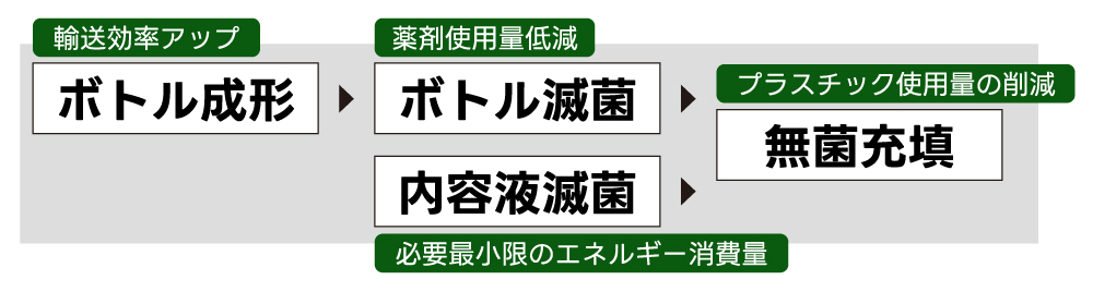 ・無菌充填:内容液を常温で充填することで容器の薄肉化が可能となり、プラスチック使用量を削減