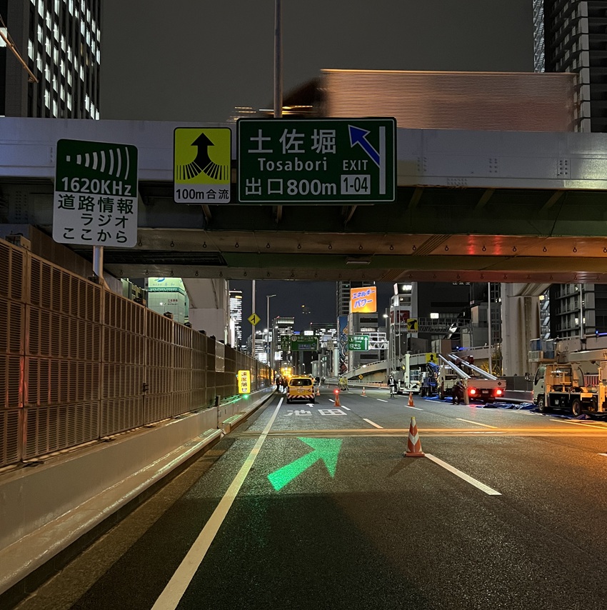 阪神高速技術株式会社は、夜間工事区間の手前で矢印パターンを路面に照射し、ドライバーに早めの車線変更を促す取り組みを行いました。内照式予告看板と併用することで従来よりも視認性が高まり、工事帯への進入事故の抑止につながりました。