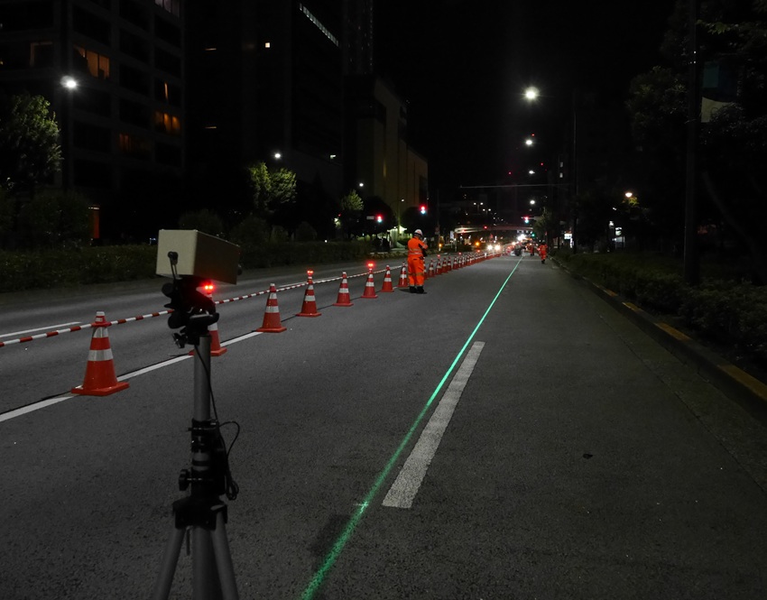 | 「DNP高視認性パターンライト」を用いた「G-スクライト工法」 区画線工事の罫書き作業をパターンライトのレーザー表示で行う工法。従来の区画線施工に比べて、約21%のコストを削減し、工程を約35%短縮させる実績が得られている。 |