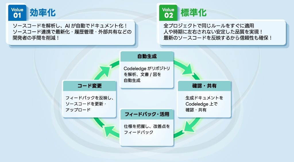 Codeledgeとは、GitHubと連携してソースコードをAI解析し、技術ドキュメントを自動生成・更新するサービス。文章だけでなくフローチャート等の図版も生成でき、編集・更新履歴を一元管理することで、ドキュメント作成の手間を減らし、品質の標準化と開発生産性向上を支援する。