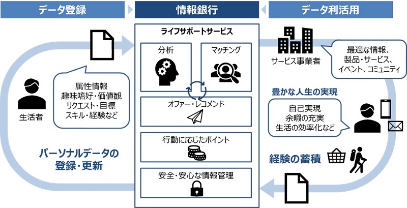 両社は、生活者が情報銀行に預託したパーソナルデータを生活者の同意に基づきサービス事業者へ提供することで、日々の充実した生活を支援する最適なサービスのマッチングや、生活を効率化する各種手続きの支援を行うライフサポートサービスの開発を行います。