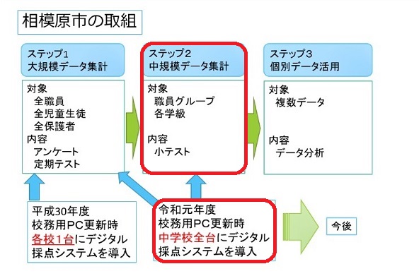 相模原市の「リアテンダント」導入ステップ(同市教育委員会作成)。「ステップ1」のアンケート集計を経て、現在は「ステップ2」のテスト採点での活用が進んでいる。今後は「ステップ3」のデータ分析による指導の改善に向けた取り組みを目指す。