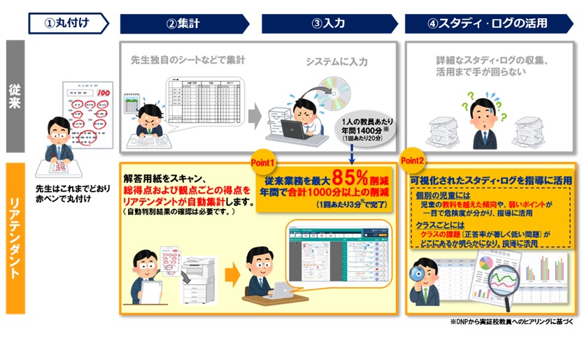 DNPは、2020年2月に政令指定都市・中核市を含む7自治体にて、小学校の「評価テスト」によるスタディ・ログの自動集計・蓄積・活用に関する実証評価を開始しました。当実証は、青葉出版、教育同人社、新学社、日本標準など、「評価テスト」を発行する主要7社*1中5社の協力のもと実施しました。実証校の教員からは、テストの集計・入力作業時間が最大で85%削減されたとの声を得ており、学校では蓄積したデータを「リアテンダント」上で分析することで、児童ごとのカルテを作成し、児童一人ひとりに対応した指導を実現しています。