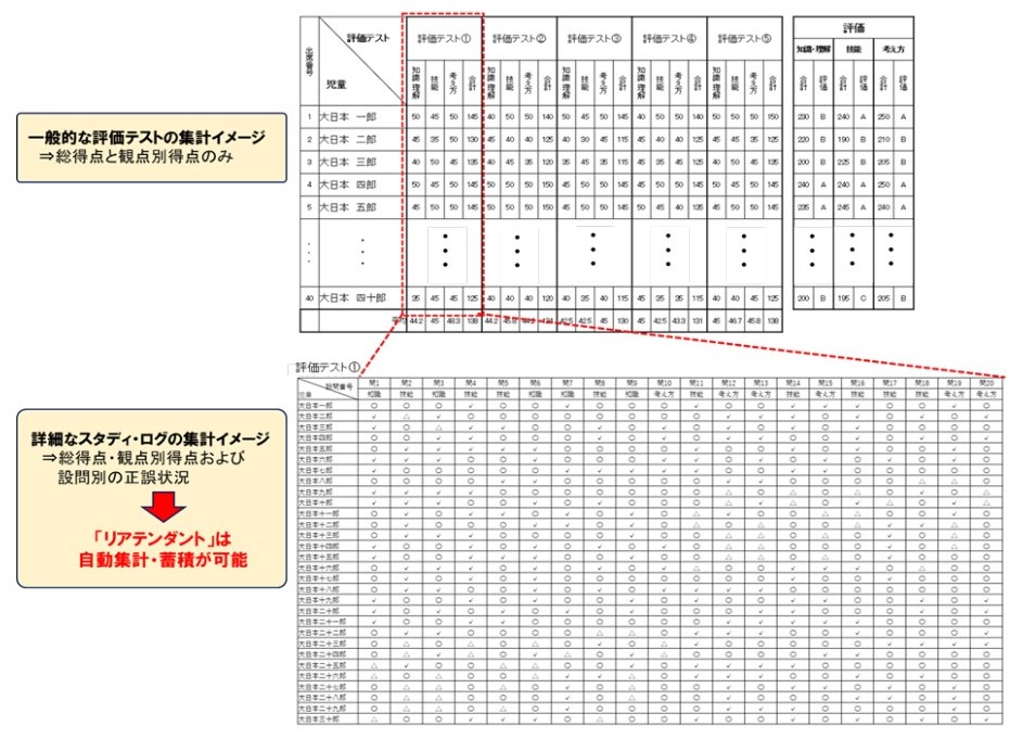 学習支援プラットフォーム「リアテンダント」の主要機能として、小学校の「評価テスト」をAIで自動集計し、ビッグデータを蓄積・分析するモデルを開発
