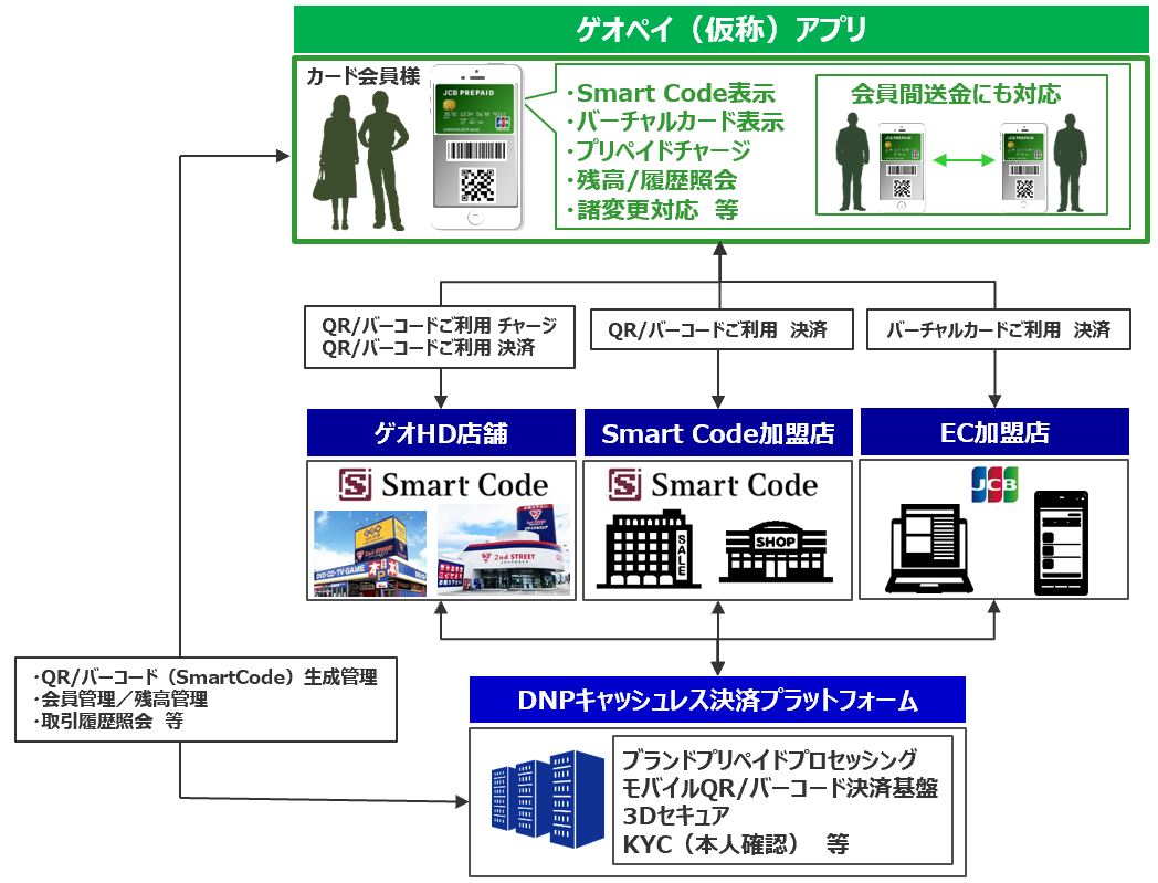 大日本印刷株式会社(以下:DNP)と、株式会社ゲオホールディングス(以下:ゲオHD)グループの株式会社ゲオペイメントサービス(以下:ゲオペイメント)、株式会社ジェーシービー(以下:JCB)は、ゲオペイメントのバーチャルプリペイド「ゲオペイ(仮称)」の2020年秋以降の開始に向け、基本合意契約を締結しました。「ゲオペイ(仮称)」は、「DNPキャッシュレス決済プラットフォーム」と、JCBのQR・バーコード決済スキーム「Smart Code」を採用する予定です。全国のSmart Code加盟店の店頭でQRコード決済ができ、かつWEBでもJCB加盟店で利用可能なプリペイドサービスは、「ゲオペイ(仮称)」が初めてです。