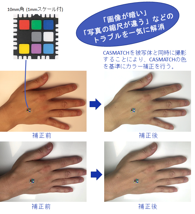 - DNPの画像補正サービスは、患者が自分の頬や手などに「CASMATCH」を貼り付けて撮影し、専用ソフトにより、使用する情報機器のカメラの性能や室内の照明による色ムラなどを補正し、遠隔のパソコン上で簡単に複数の患者の画像を一定水準の色調で表示することができます。