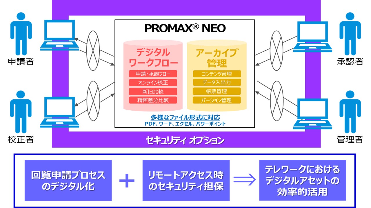 それに対してDNPは今回、オンラインの回覧・審査業務の効率化、平準化、品質向上を支援するPROMAXのデジタルワークフローとアーカイブ機能を強化し、テレワークで複数部門のデジタルアセット(資産)を利用するコラボレーション作業を円滑化していきます。また、オプションとして追加するセキュリティ機能は、総務省が策定した「テレワークセキュリティガイドライン」に準拠しています。