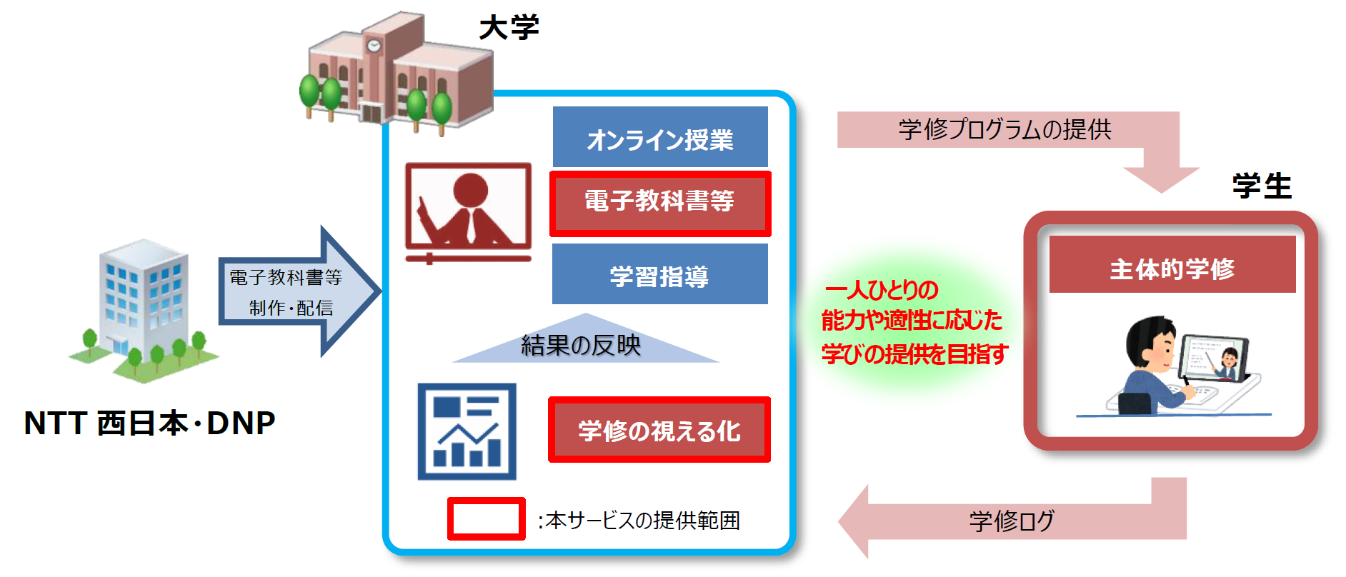 ICTを活用し社会課題の解決をめざすNTT西日本と、電子教科書・教材、電子図書館事業等を通じて、教育のICT化を推進するDNPは、2020年4月に、京都先端科学大学と武庫川女子大学に電子教科書の閲覧が可能な学内システムを、システムインテグレーション*3により導入しており、このたび、前述のような社会的要請を受け、教育の質向上等の社会課題への取組みを更に強化しました。具体的には、共同で教育ICTプラットフォームを構築し、マルチデバイスからの教科書・教材の提供、図書館利用と学修時間・学修行動の把握といった学修情報管理等のサービスを提供します。