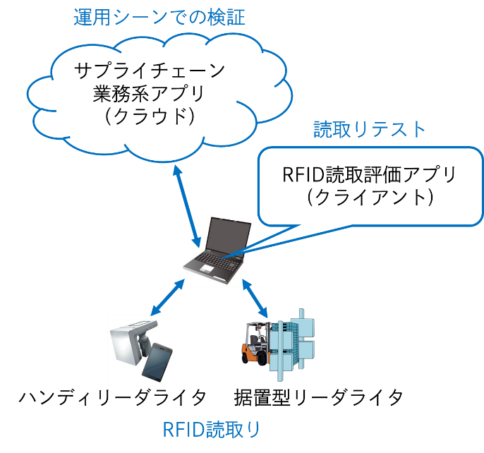 製造・物流や流通・小売等の現場でRFIDを導入するためのPoCを簡易に実施できるようにするために、システム・機器の貸し出しと、現場でのRFID読取り環境構築のノウハウを提供し、下記2つのアプリを使用して検証・評価レポートの作成を支援します。
