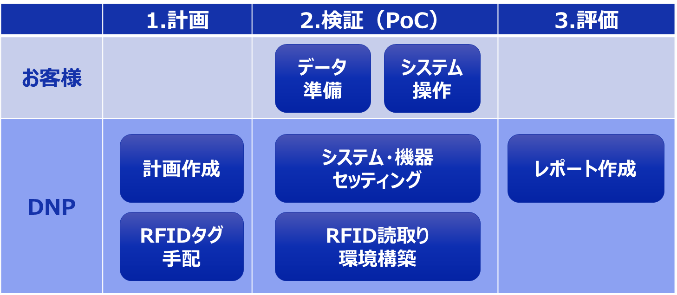 RFIDの活用は、事前の導入効果検証や運用を想定した課題の抽出が重要な成功要因です。その評価をするために、これまでは機器の購入や簡易システムの開発など検証準備にかかる負荷が大きく、検証作業の障害となっていました。DNPは今回、このような効果検証を短期間かつ安価で実施できる導入支援サービスを開始しました。