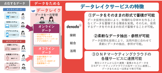DNPはSaaS(Software as a Service)として提供する「DNPマーケティングクラウド」でデータを蓄積する「データレイク機能」に今回、データ仮想化サービス「Denodo Platform」を導入し、デジタルトランスフォーメーション(DX)を推進する企業のデータ活用を支援します。