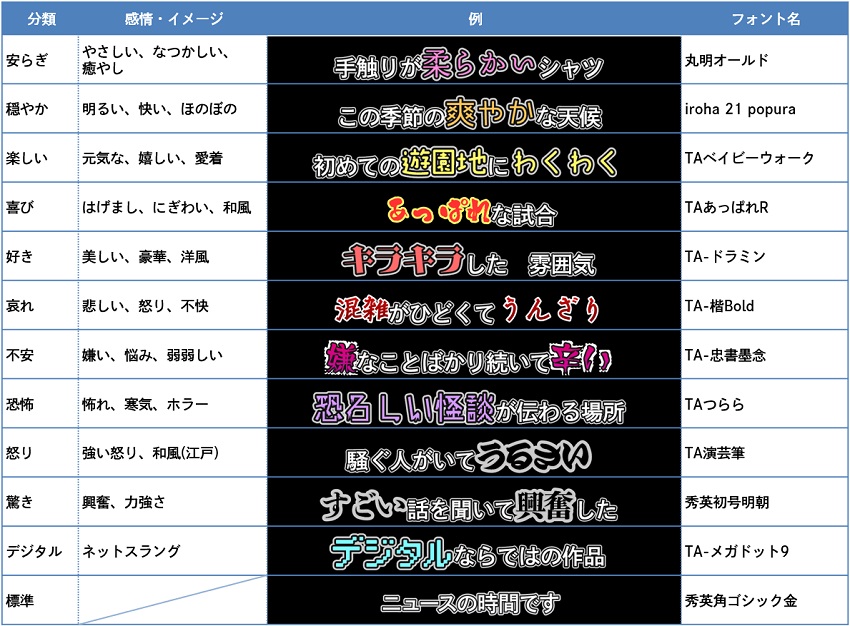 ■12種類の感情・イメージと使用フォントの組み合わせ例(感情の分類やフォントは手動で変更可能)