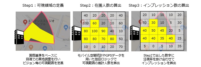 - 株式会社NTTドコモの携帯電話ネットワーク運用データを基にした人口統計 「モバイル空間統計」やGPSデータ等を活用し、個々のディスプレーについて、時間帯ごとの広告視聴推定到達数を計測します。各広告主がターゲットとする生活者への広告到達率が高い場所や時間を推定しやすくなり、定量的データに基づくDSPによる取引を実現します。