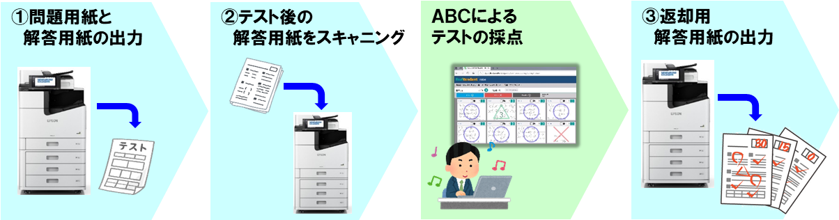 DNPのデジタル採点ソフトABCは、テストの採点業務を効率化するアプリケーションで、解答後の答案用紙をスキャンし、デジタル化して同アプリケーションに取り込むと、教員のPC上で簡単に採点することができます。これまで導入してきた自治体では、採点時間が平均で約60%削減した実績を持ちます。しかしながら、教員が自作した問題用紙や答案用紙の出力、解答後の答案用紙のスキャナ読み込み、採点後の答案用紙の出力作業など、業務時間削減には複合機の性能に頼る部分もあります。さらに、「採点後の解答用紙はカラーで出力して生徒に返却したい」というABCを利用する教員からの要望も多くあるなか、学校現場では、コストの関係からモノクロで出力しているケースもありました。エプソンの教育現場の課題解決に貢献するパッケージであるエプソンのスマートチャージ「アカデミックプラン」*2では、カラーもモノクロも同額で出力することができるため、コストを気にせず、カラーで出力し返却することができます。