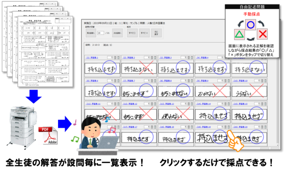 - 一覧表示によって確認しやすくなり、採点ミスを削減します。