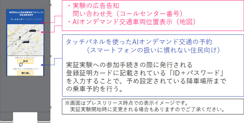 DNPは2019年10月から、しずおかMaaSに技術会員として参加しています。今回DNPは、2020年度の本プロジェクトにおいて、静岡市のJR草薙駅前とJA清水厚生病院に通信型タッチパネル式屋外サイネージ(のりばに設置された呼び出し画面)を提供します。これにより、AI配車システムによってリアルタイムな需要に応じるAIオンデマンド交通を気軽に予約できる「しずおかMaaS」の実証実験に参画します。