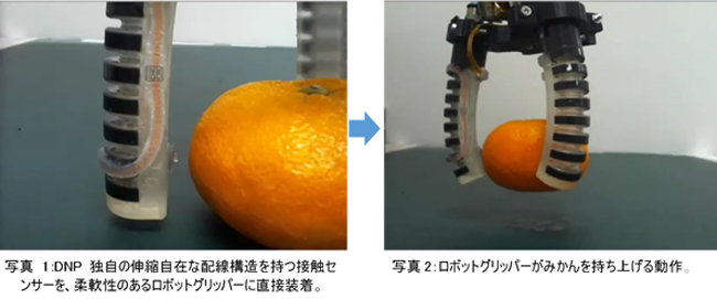 大日本印刷株式会社(本社:東京 代表取締役社長:北島義斉 資本金:1,144億円 以下:DNP)は、AIやセンサー等を活かしてモノをつかむ「ロボットグリッパー」に対し、樹脂等の柔軟な部分にも直接装着できる、DNP独自の伸縮自在な配線構造を持つ「接触センサーユニット」を開発しました。このユニットにより、これまで人が行ってきた果物や野菜などのピッキング作業を、柔軟性のあるロボットグリッパーで自動化できるようになり、省人化を実現します。