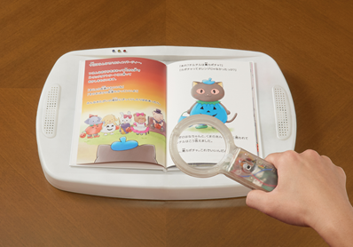 ○市販の絵本や図鑑などをそのまま利用することが可能です。見たいものを「魔法のような虫めがね」を通して見ることで、絵本であれば音声やBGM、図鑑であれば動物などの鳴き声がスピーカーから聞こえてきます。