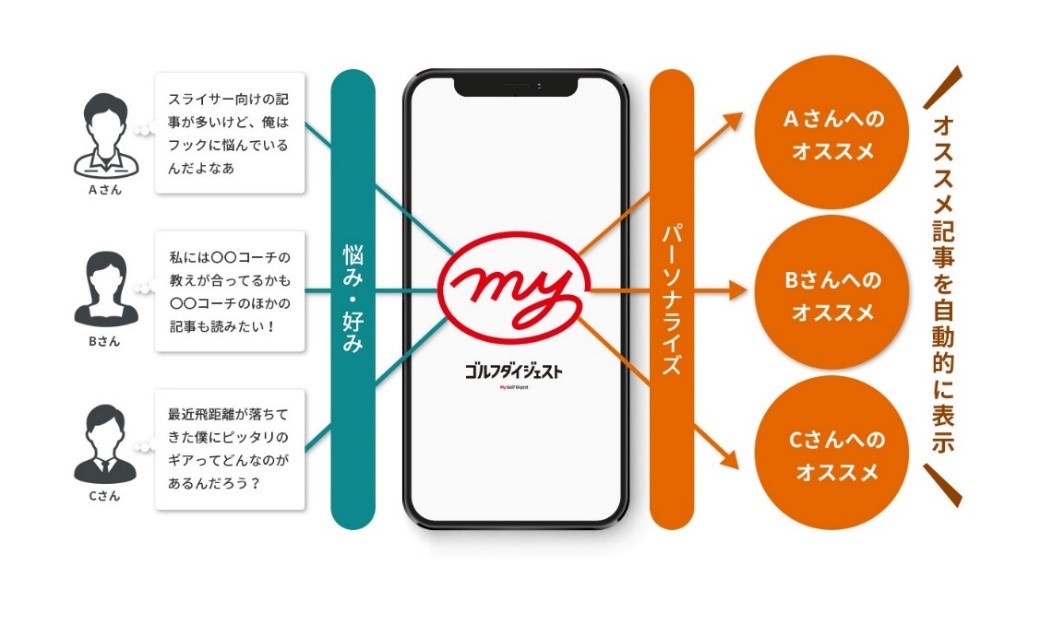このサービスの第一弾として、ゴルフ専門出版社の株式会社ゴルフダイジェスト社(本社:東京 代表取締役社長:木村玄一 資本金:2,125万円)と協業して、ゴルファーの悩みや好みにあった最適な情報を提供する会員制サービス「Myゴルフダイジェスト」を立ち上げ、2021年1月13日に無料版の提供を開始しました。