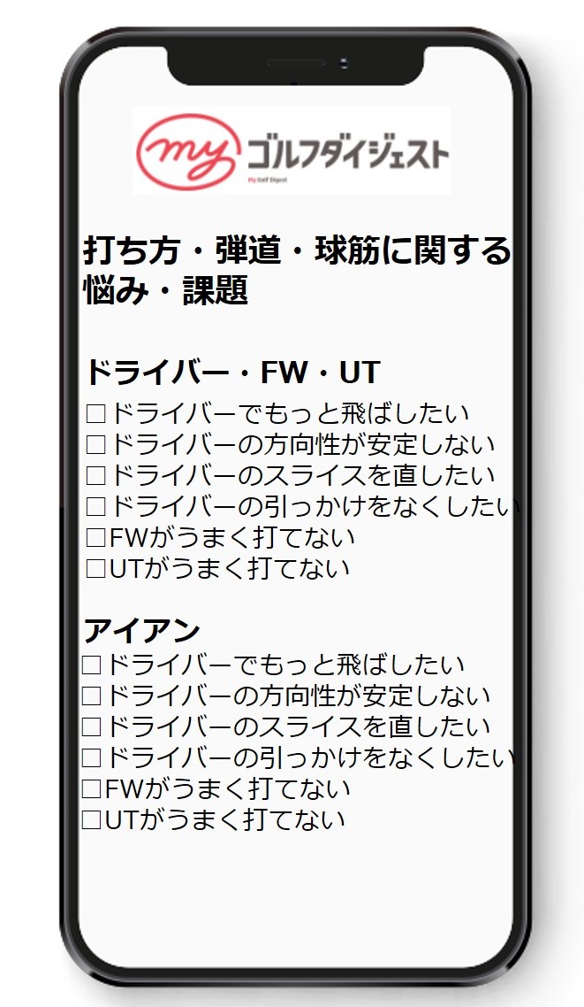 - 利用者は会員登録時に、年齢・性別・身長・ゴルフ歴・プレイスタイル等の情報を入力するほか、ゴルフに関する悩みを約100項目の中から選択します。それに従って悩みを診断し、その診断結果を基にマッチングエンジンが読者に最適な記事を抽出します。