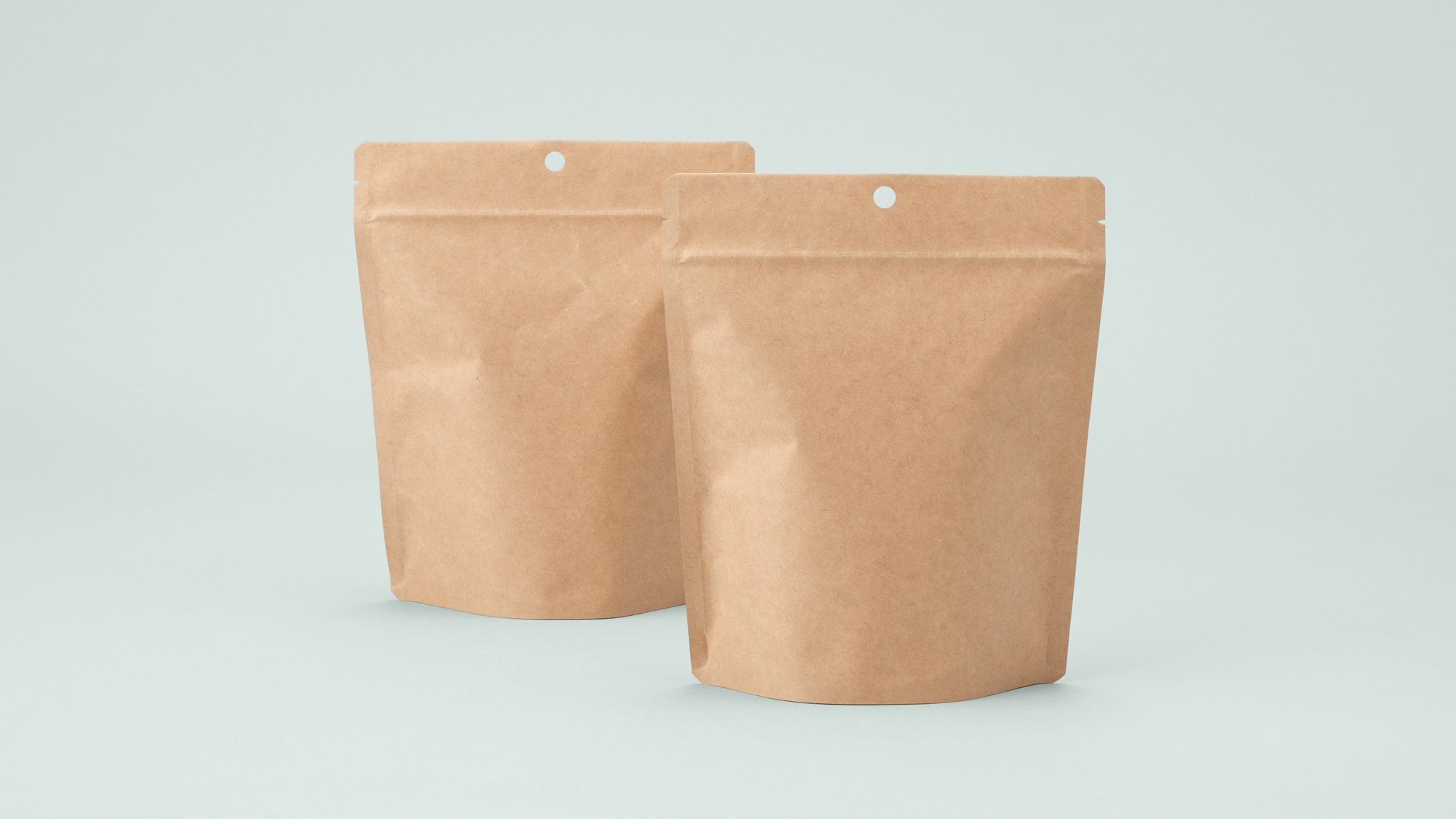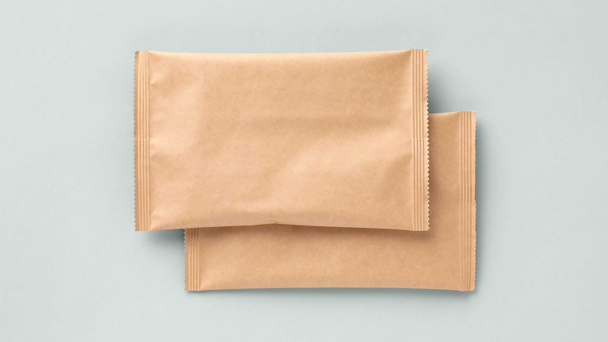 「DNPスーパーハイバリア紙包材」のピロー袋(左)とチャック付きスタンド袋(右)