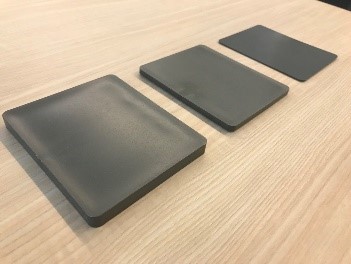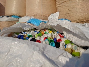 回収されたプラスチック製のフタ(左)と再生材から作られたプレート(右)