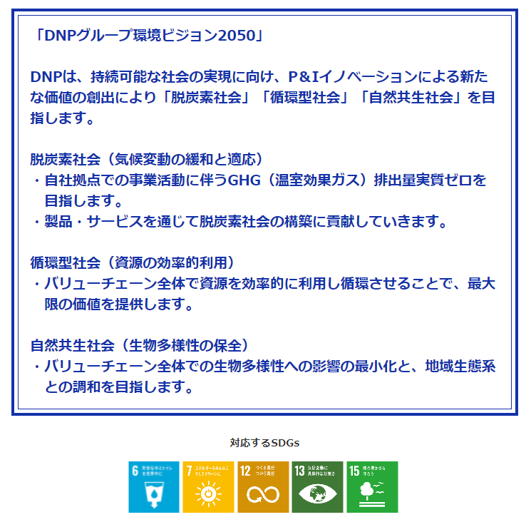 DNPは、1972年に業界に先駆けて環境専門の部署を設置するなど、早い時期から環境関連の課題解決に取り組むとともに、環境配慮製品・サービスの開発・提供を推進するなど、持続可能な社会の実現に努めてきました。こうした活動を加速させるため、2020年3月には「DNPグループ環境ビジョン2050」を策定し、社員一人ひとりがあらゆる事業において環境との関わりを強く意識し、「脱炭素社会」「循環型社会」「自然共生社会」の実現を目指すことをあらためて明示しました。