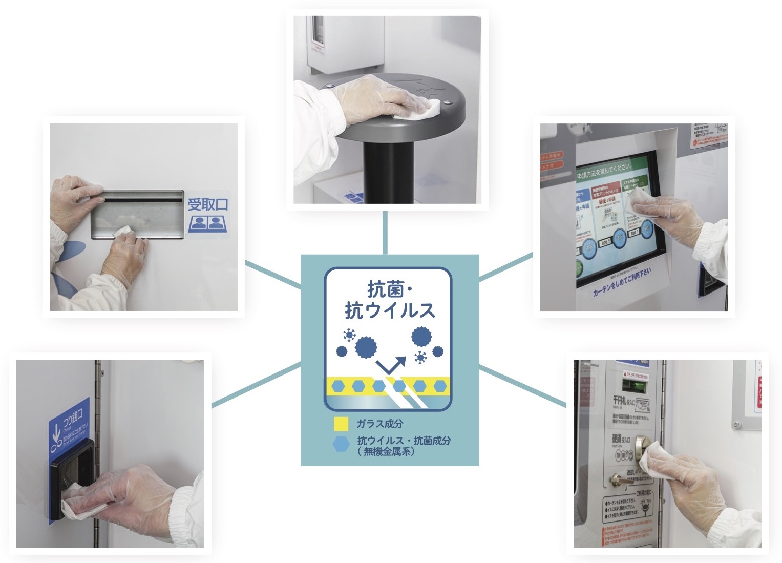 生活者の安全・安心を確保するため、タッチモニター、硬貨・紙幣投入口、釣銭口、返却レバー、写真受取口、椅子とその周辺を対象として、抗菌製品技術評議会(SIAA)の「SIAAマーク」取得済みの高純度のガラスコーティング剤を使用して、抗菌・抗ウイルス対策を実施します。