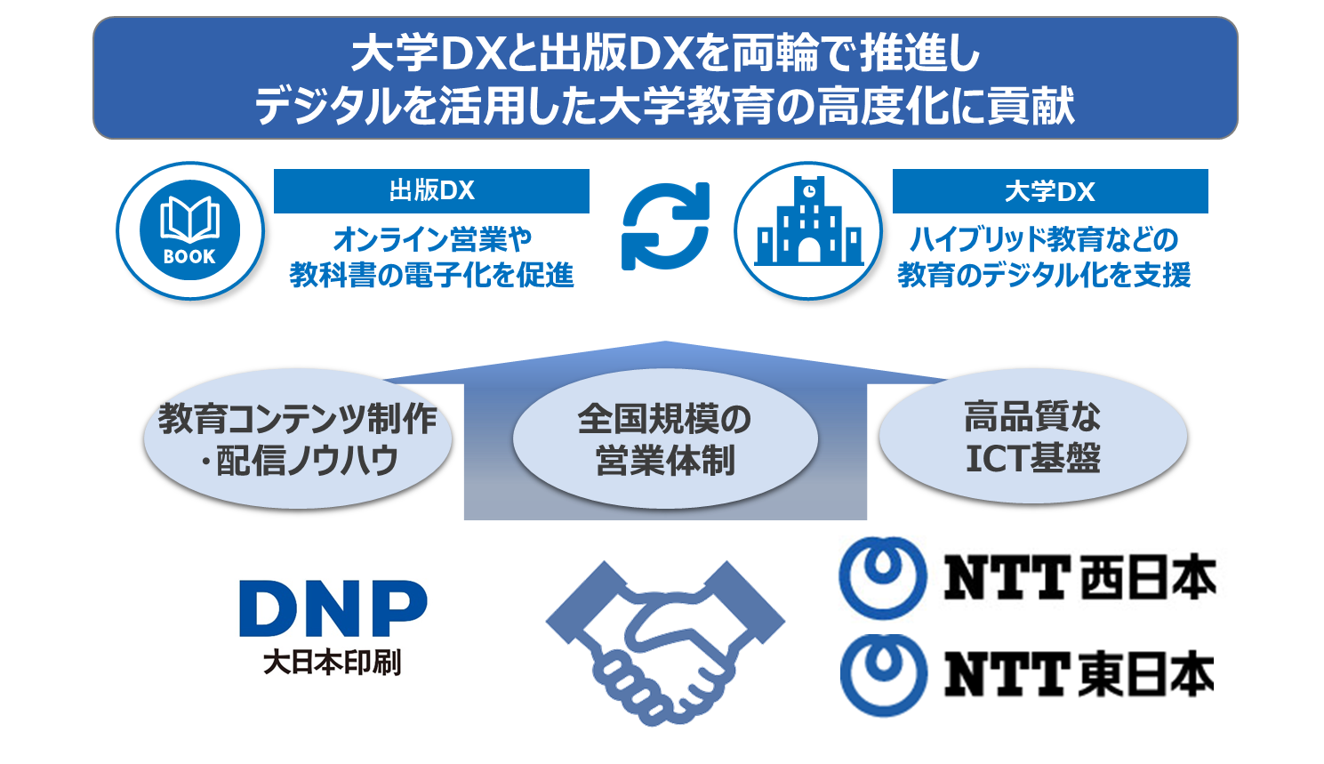 ICTを活用して社会課題を解決していく「ソーシャルICTパイオニア」をめざすNTT西日本と、P&I(印刷と情報:Printing & Information)の強みを活かして新しい価値創造をめざすDNPは、これまで大学における教育のデジタル化に向けて協業を進めてきました。2020年6月には先行実証を行っている京都先端科学大学と武庫川女子大学において、共同で教育ICTプラットフォームの構築をするとともに、マルチデバイスに対応した教科書・教材の提供や、学修時間・学修行動の把握等の学修管理サービスを提供しました。こうした取り組みを通じて、ICTを活用した教育のデジタル化におけるノウハウを蓄積するとともに、多くの大学等の教育機関や、教科書・教材の提供を行う多数の出版社からも事業賛同の要望を頂きました。そういったなかで今回、高等教育機関向け電子教科書・教材配信サービスを始めとする教育ICTプラットフォームの全国への本格展開を目的として、東日本エリアを担当するNTT東日本が新たに参画し、協業体制を更に強固とすることで合意しました。