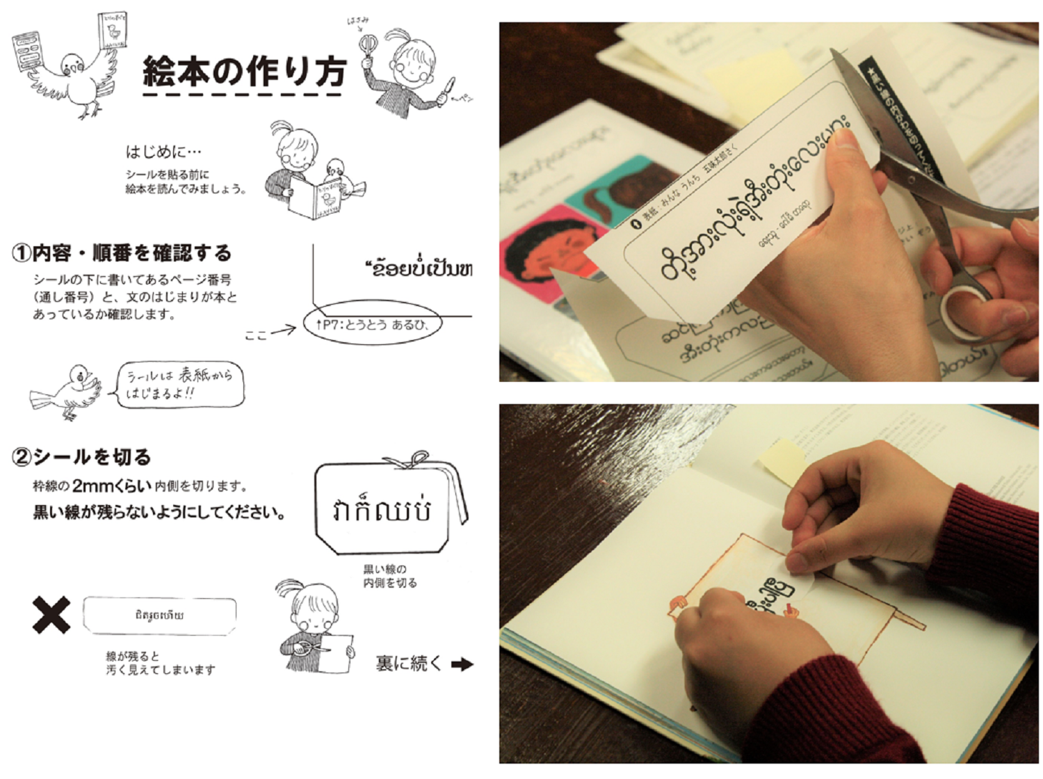 それぞれの言葉が印刷されたシールを切って絵本に貼り、作成者の名前を記入したら翻訳絵本の完成。