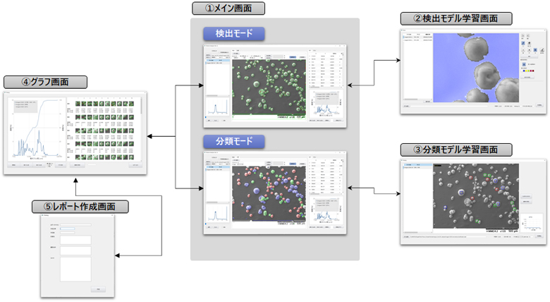 2. 分類 : 検出した個々の粒子に対して、粒子のタイプを自動的に分類します。ソフトの利用者が形状や表面状態などのタイプが異なる粒子の一部をクラス分けし、そのデータを元にAIが全ての粒子に対して分類を行います。