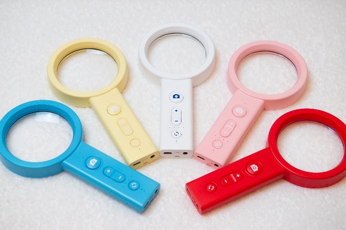 ○「魔法のような虫めがね」は、AIを搭載した専用の「虫めがね」を本などにかざすと、文字・絵・写真・イラストなどをAIが認識し、その内容を音声や音楽で教えてくれる「魔法のような」情報機器です。