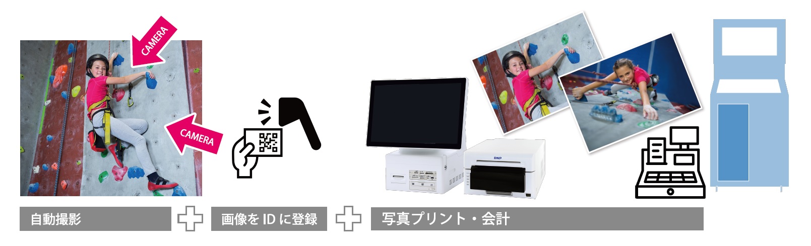 「DNP自動撮影ソリューション」は、アミューズメント施設のアトラクション等のフォトスポットで、通常では撮影困難なアングルから「自動撮影」し、利用者とQRコード等のIDを連動させた「撮影写真の一括管理と専用端末でのプリント販売」、「撮影から画像データの作成、写真プリント提供までの全工程の自動化」、「その場での写真プリントや画像データの販売」などを行います。