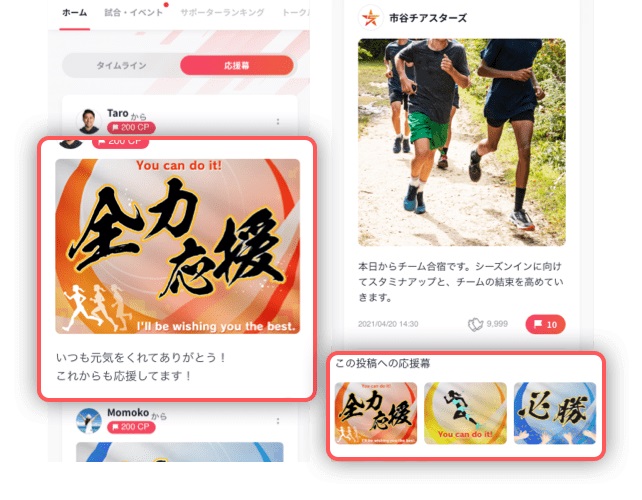 サポーターは、「チアスタ!」内にあるデザインテンプレートやスタンプ等のデジタルアイテムを選んでオリジナルの「デジタル応援幕」を作成し、メッセージを付けて無料で1日3回までアスリートに贈ることができます。アスリートは、贈られたデジタル横断幕を「チアスタ!」のWebサイト内タイムライン投稿画面にて見ることができ、あたかも競技会場で応援幕を掲げてもらっているかのような体験ができます。10月以降には有料のデジタルアイテムを発売するなど、オリジナルデザインの応援幕を作成する機能を拡充するとともに、代金の一部をアスリート・競技団体の活動資金として還元するなど、さらなる支援につなげていく予定です。