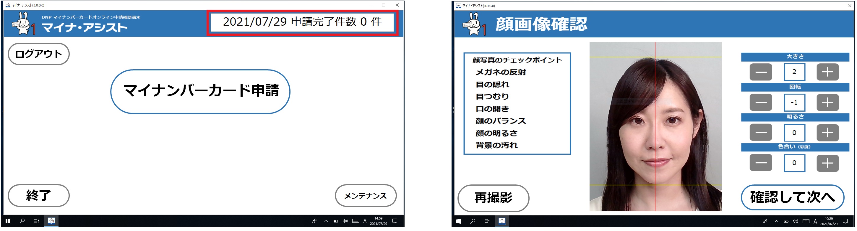 今回DNPとIDSは、「マイナ・アシスト」用に、外付けカメラに対応したアプリケーションを開発し、申請者の前に外付けのカメラを置くことで、アクリル板をずらさずに、申請者と距離を取って撮影することができるよう改良しました。感染防止に努めながら、DNPが培ってきた写真技術を活かして、ID証に適した顔写真の品質を実現します。また、タブレット端末上の管理者画面に当日の申請件数を表示し、日々の報告業務の効率化が図れる機能も追加しました。