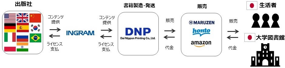 • DNPは、ライトニングソース社が各国の出版社から許諾を受けた作品を、グループ会社である丸善雄松堂の書籍販売サイト、ナレッジワーカー(https://kw.maruzen.co.jp/)より提供を開始するとともに、今後は自社が運営するハイブリッド総合書店「honto」の書籍販売サイトやAmazon*2での出品・販売を予定しています。