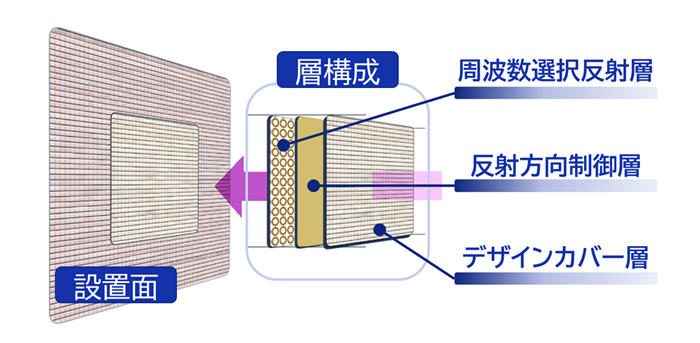 本製品には、所定の周波数帯を選択的に反射して、それ以外の電波を透過する層「周波数選択反射層」と、入反射する電波の方向を決める特殊な誘電体層「反射方向制御層」があります。