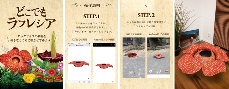 最大で直径111cmにもなる「ラフレシア」と、最大で高さ310cmにもなる「ショクダイオオコンニャク」を、AR技術によりスマートフォンカメラを通したリアルな空間に実寸大の植物が3DCGで再現され、撮影することができます。アプリをダウンロードやインストールすることなく、QRコードを読み込むだけで、展覧会場や、家や外出先など、どこでも好きな場所に植物を咲かせることができ、多様なオリジナル写真を楽しむことができます。