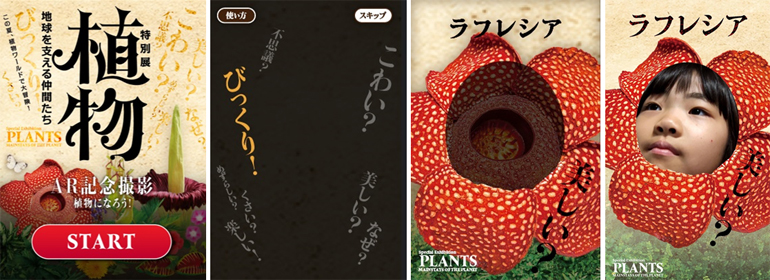 本展覧会は、世界の珍しい植物を総合的に紹介する大規模な企画で、標本・模型・映像のほか、空間全体を変化させたりして楽しむインスタレーション展示などにより、来場者は“知られざる植物ワールドの驚きの実像や魅力、謎”を楽しむことができます。今回、AR技術を活用したスマートフォン用webアプリを開発し、以下の2つのサービスを提供しています。
