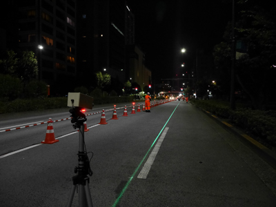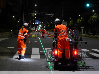 近年の国際マラソン大会では、競技コースの測定線に沿って、ランナーを誘導するガイドラインを路面上に施工しています。ランナーにとって視認性の高いガイドラインを引く必要がありますが、車の反対車線側をランナーが走ることもあり、縁石や道路標示等を目安にしにくいといった制約があるほか、石灰等で作業線を引く「墨出し作業」の負荷が高いなど、施工の難易度が高いことが課題となっています。また、都市部での作業は、夜間に道路規制を行った上で素早く終了させる必要があります。