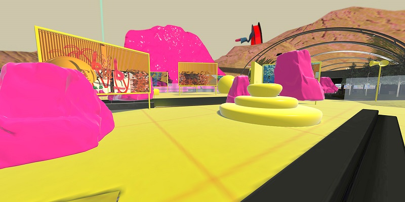 ○藤倉麻子氏は、3DCGを使い、普段見えている風景の先を想像したビビッドな世界を宮下公園のバーチャル空間に出現させます。藤倉氏ならではの感性で、空や建物を鮮やかな色彩に塗り替え、ピンクの艶めく岩が行き交います。