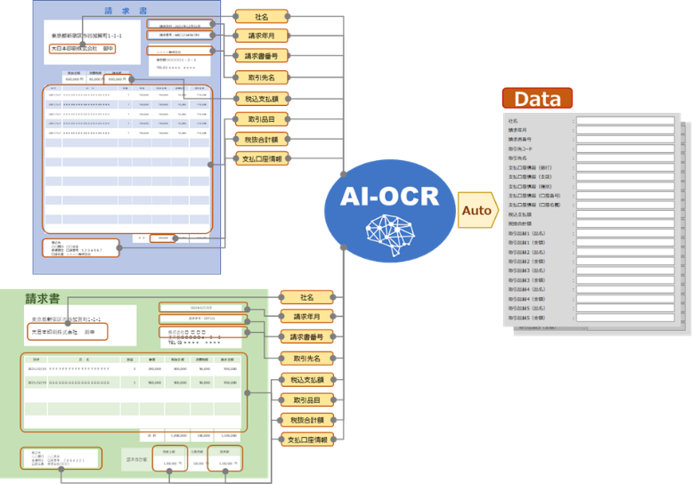 新設した業務集約部門で、取引先からの請求書を直接受け取り、請求書の代理入力も実施しています。その際、多種の請求書フォームを自動判定し、AIが自動で読み取りたい項目を抽出するAI-OCRを利用し、入力の自動化を実現しました。