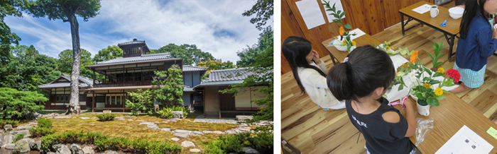 会場となる重要文化財 旧三井家下鴨別邸(左)、いけばな協会講師によるいけばな体験(右)