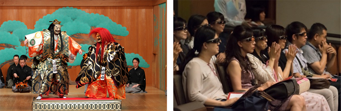 演目:能《舎利》©公益社団法人能楽協会(左)、スマートグラスを利用した能楽鑑賞(右)