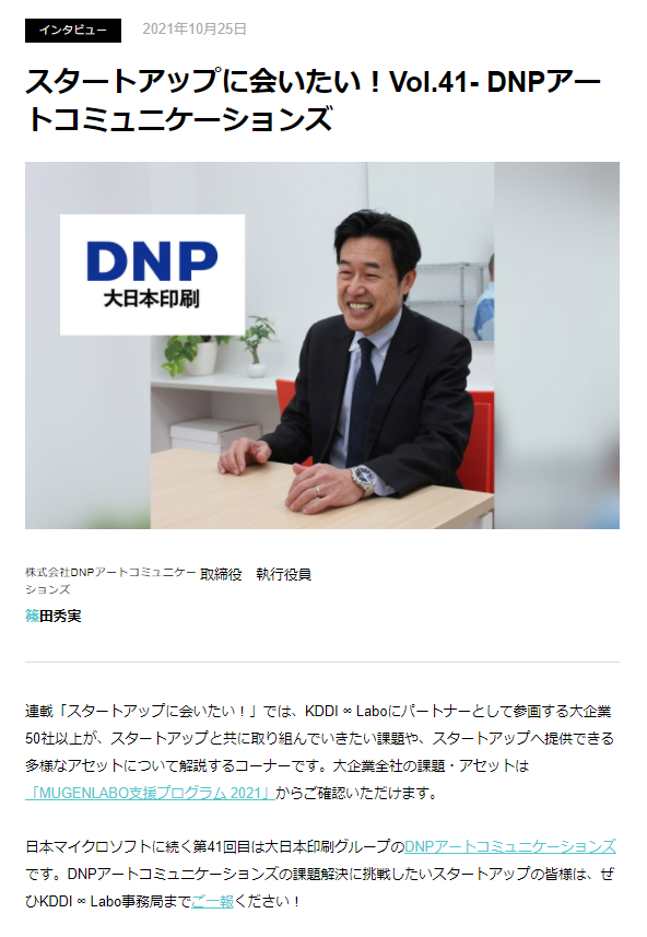 オープンイノベーションをテーマに情報を発信するサイト「MUGENLABO Magazine」の連載「スタートアップに会いたい!」Vol.41で 、DNPアートコミュニケーションズが紹介されました。
