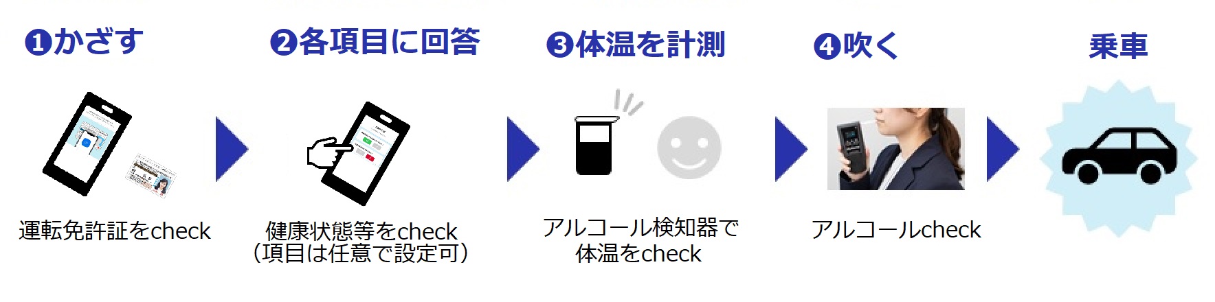 - なりすまし防止 : アルコール測定中の顔写真を撮影することにより、本人確認を行います。